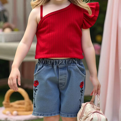 Summer 100% Pure Cotton Breathable Children's Suit for Girls Girls' Vest Denim Shorts Set